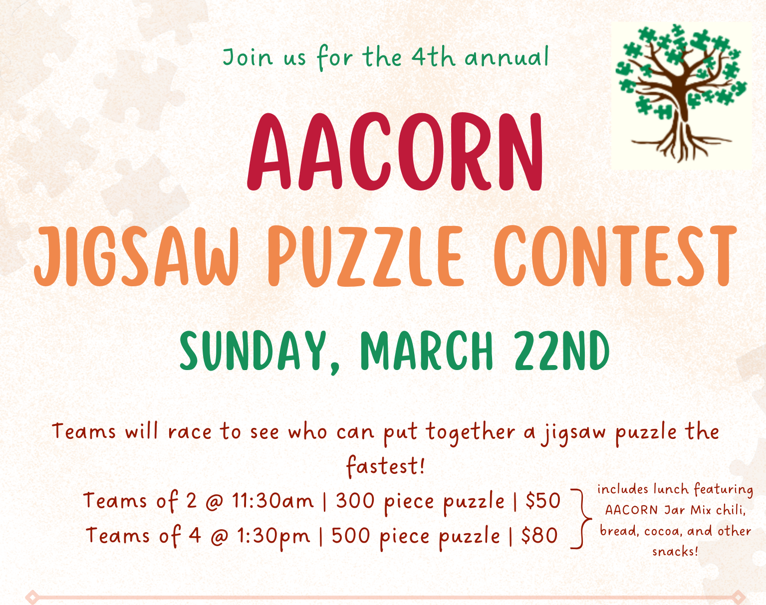 Plan on joining us Sunday, March 22nd at our 4th Annual Puzzle Contest! Your team registration will include a delicious lunch featuring many of AACORN’s famous recipes including Painted Desert Chili, Beer Bread, Double Chocolate Brownies and Southwestern Dip. There will also be coffee and cocoa to warm you up on what will likely be a chilly winter day.